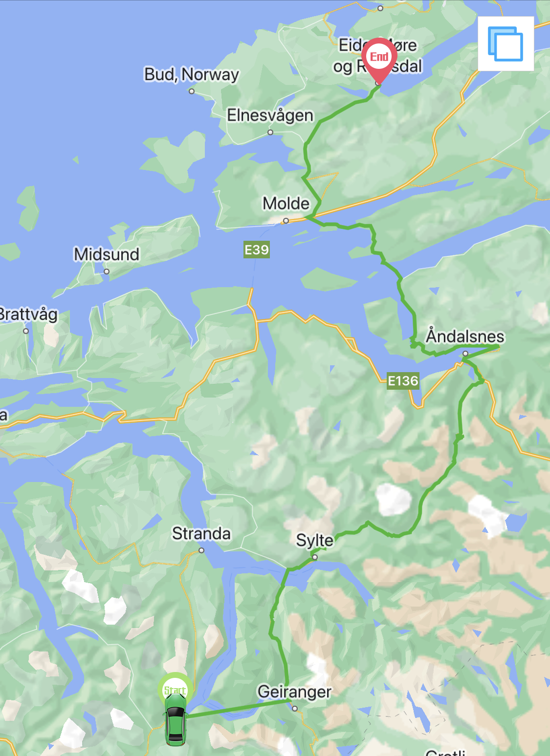 Wat een schitterende route! Met de boot door de Geirangerfjord van Hellesylt naar Geiranger. De hoogvlakte op en dan met de Trollstigen naar beneden en door het schitterende landschap naar Eide.