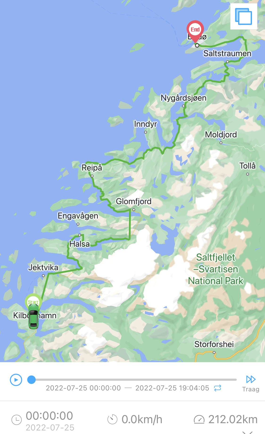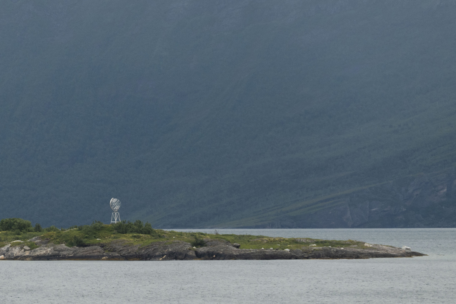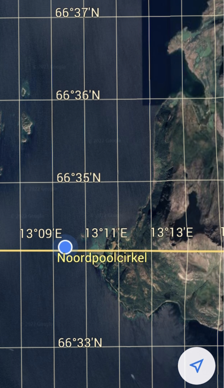 We worden wakker met diepgrijze regen (natuurlijk) en dat blijft het grootste deel van de dag zo. We beginnen de dag met de ferry naar Jetvik. Die brengt ons om 10:14 over de poolcirkel! Je merkt er precies niks van en toch is het zo’n moment. De rest van onze tocht naar de Noordkaap brengen we steeds verder boven de 66o34’N door.