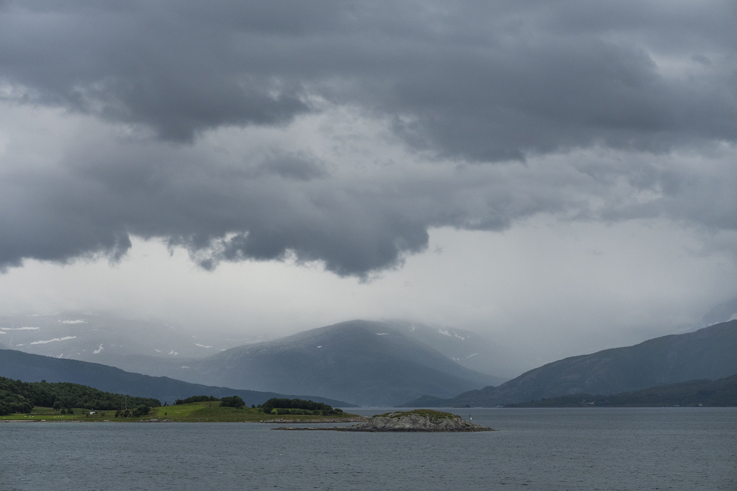 Ook zonder zon is het landschap fenomenaal. We rijden de laatste etappe van de Kystriksveien. We kijken met groot genoegen terug op die prachtige 650 km!